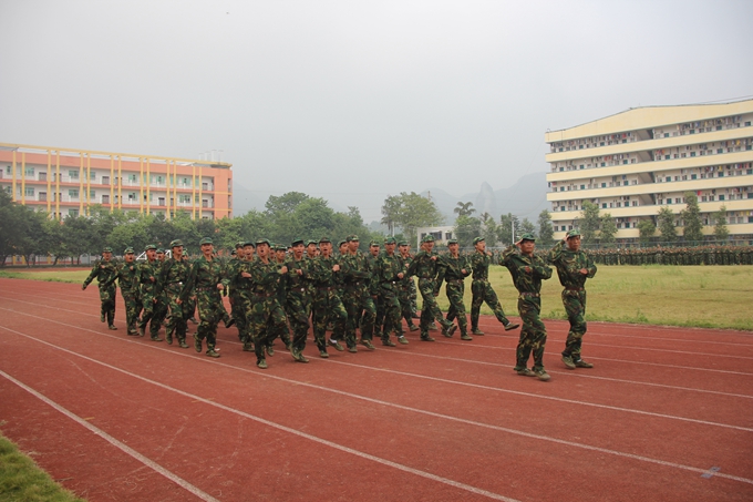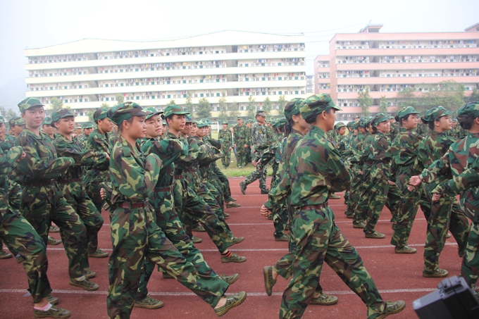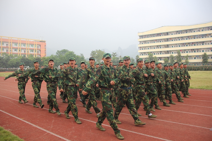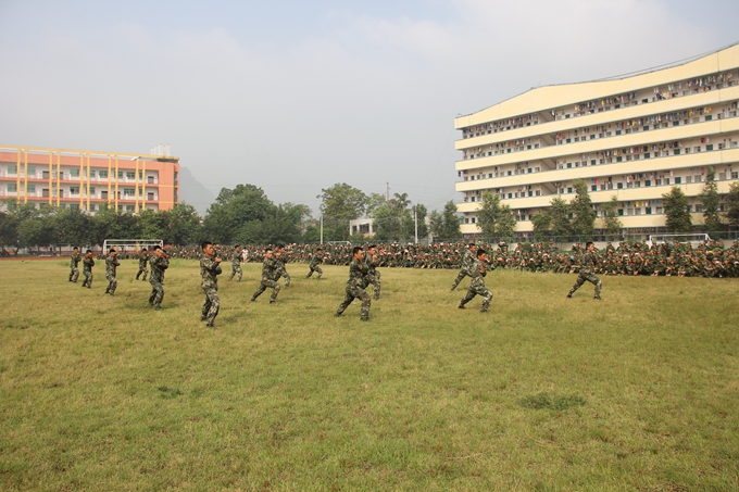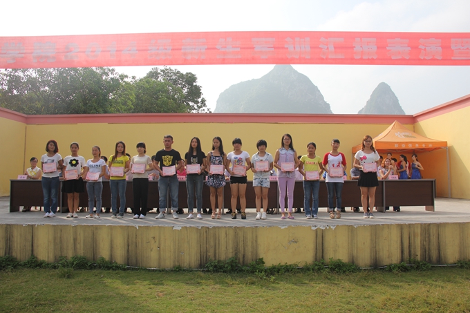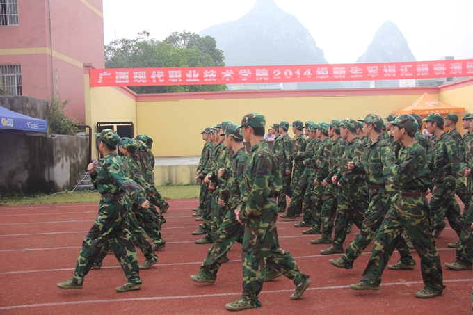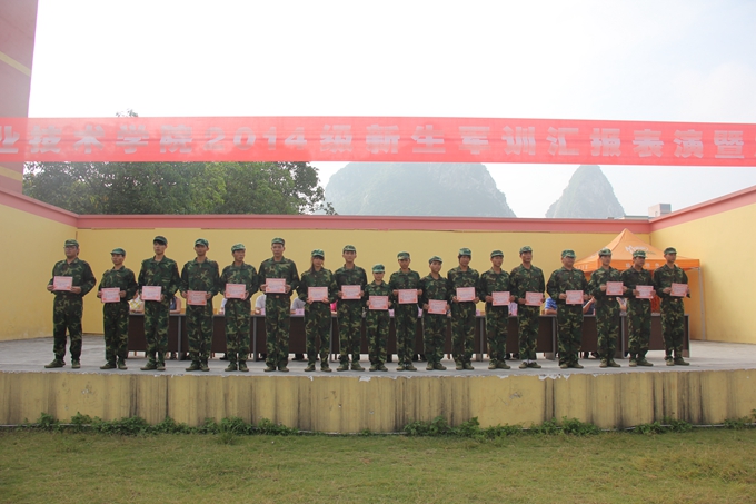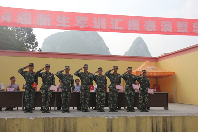 党委宣传部讯 飒爽英姿秋点兵,激昂斗志威震天。9月15日,我院2014级学生军训汇报表演暨总结表彰大会在学院田径运动场隆重举行。纪委书记覃志航在会上作军训总结讲话。副院长韦胜东宣读军训表彰决定。大会由学工处处处长岑华主持。武警河池市支队参谋长范长俊,学工处、团委、教科处、后勤处、保卫处、各教学系有关领导老师以及2300多名参训新生参加大会。