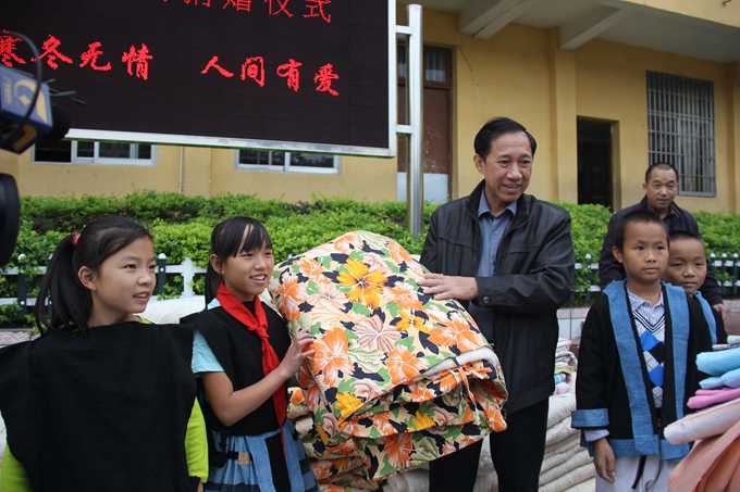 捐赠仪式上,韦胜东副院长代表优米体育入口官网下载手机版向里湖小学捐赠了棉被、床单、席子各700床,用于帮扶贫困学生。韦副院长表示,学院对南丹县里湖小学怀有深厚的感情,十年前曾派教师到这里进行支教。里湖乡属于瑶族自治乡,经济相对薄弱,学生家庭条件普遍较差,在寒冬里能盖上温暖的棉被是很多贫困生期盼已久的心愿。学院心系瑶乡贫困学生,得知里湖小学很多贫困生无棉被过冬的情况后,特别组织进行了这次捐赠活动,表达了学院对里湖小学的深情厚谊。他勉励全校学生越是在艰苦的环境中,越是要刻苦学习,早日成才,报效祖国,回报社会。