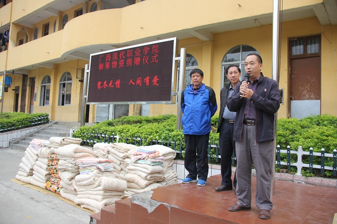 仪式上,南丹县教育局副局长李桂对我院的助学义举表示衷心的感谢。他说,天气寒冷,广西现代职业技术学院的领导在百忙中来到里湖小学捐资助学,让里湖小学充满融融暖意,希望里湖小学的同学们要立存高远、发奋成才,以感恩之心报答学院的真情实意。