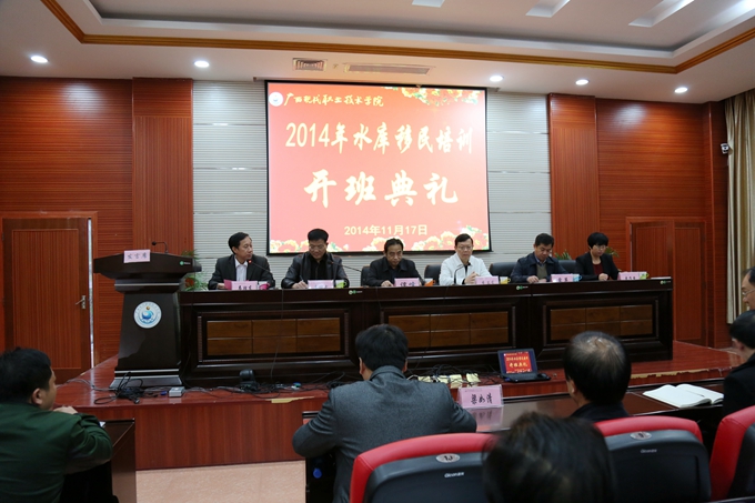 学院培训部讯 11月17日上午,2014年广西水库移民劳动力培训班开班典礼在学院第二学术报告厅隆重举行。自治区水库移民局副局长谭峰,河池市水库移民局局长韦继武出席开班典礼。自治区水库移民局培训处处长覃革、副处长李海燕,河池市移民局、学院培训部主要负责人,柳州、河池相关库区县市的带队领导以及参训学员参加了开班典礼。典礼由副院长韦胜东主持。