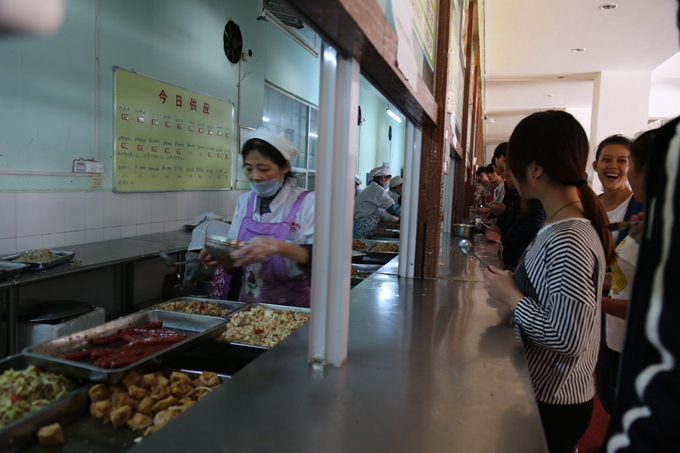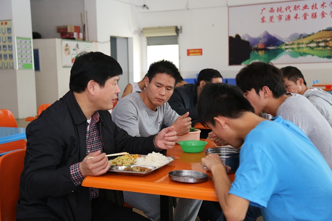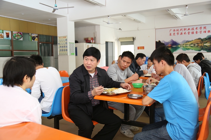 当天下午,韦伟松来到学生食堂一楼餐厅售卖窗口,向食堂工作人员仔细询问了饭、菜的供应情况,当得知食堂在一线工作法整改落实工作中效果显著时,他表示满意。随后,韦伟松与学生一起用餐,亲自体验食堂饮食服务整改效果。他还仔细询问了学生对食堂菜肴质量、价格以及服务态度等方面的看法,认真听取、记录了就餐学生对学校食堂工作的建议和意见。学生们都普遍反映,学院实施一线工作法后,食堂饮食服务方面都有了很大的改进,饭菜比以前好吃多了。