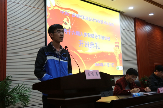 开班典礼上,经济管理系、教育系黄琳慧同学代表优秀学员发言,向新学员谈了自己在党校学习的收获与体会。电子电力工程系的谢庆策同学作为本期学员代表发言并郑重承诺,要树立正确的世界观、人生观和价值观,坚持正确的政治方向;要努力学习,积极思考,勇于创新,力争学有所获;要加强道德修养,努力把自己培养成为党和人民需要的、符合时代要求的高素质应用型人才。