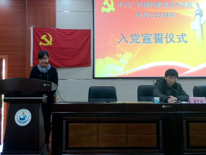 大会伊始,全体起立奏唱《国歌》,潘华林部长随后宣读《关于批准潘杨等72名同志为中共预备党员、杨桂华等105名预备党员转正的通知》,所有新党员在学院党委组织部副部长卢喜朋老师的带领下,面向党旗庄严宣誓。接着,学生正式党员代表陆宏政、预备党员代表覃安思分别发言,他们表示,今后在学习上会更好端正态度,在工作上更加一丝不苟,以党员的标准更为严格要求自己,为不断提升思想觉悟,遵守党纪,严于律己做好模范带头作用。随后,纪委书记覃志航发表讲话,他首先向全体新党员加入党组织表示热烈祝贺,并指出,从组织上入党容易,但从思想上入党则是一个漫长的过程;他希望同学们能积极学好党章,提高思想政治修养,主动进行党性锻炼,强化组织纪律观念,坚定中国特色社会主义共同理想,无愧于共产党员的光荣称号。最后,潘华林部长对会议作了小结发言,他要求大家要在一言一行中体现党员的先进性,在各种活动中自觉实践党性,深化理论学习,努力发挥好党员的先锋模范带头作用。