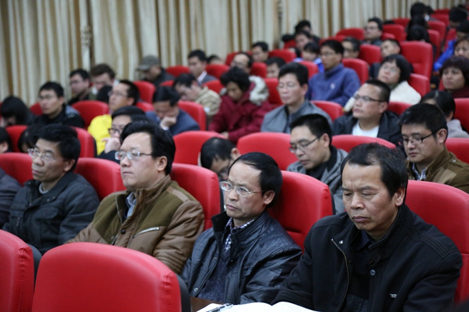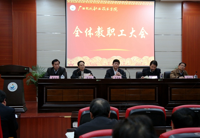 学院党委宣传部讯 3月12日下午和晚上,我院在第二学术报告厅召开全体教职工大会。大会表彰了学院2014年度“工作业绩突出”人员,听取和评估了各系部主任的工作报告,部署了2015年工作任务。市委副秘书长、学院党委书记韦伟松,院长黄绍光出席大会并作重要讲话。会议由纪委书记覃志航主持。副院长冯忠伟、韦胜东参加会议。