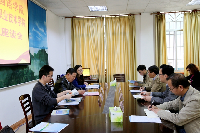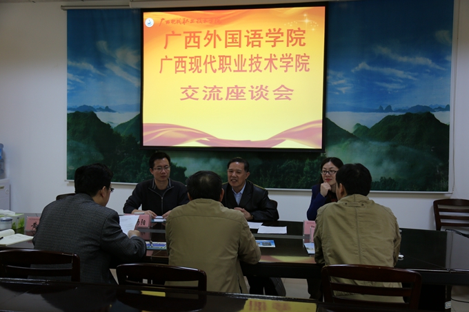 会上,冯忠伟副院长代表学院对韦克俭副校长一行的到来表示欢迎,并与韦克俭副校长一行共同观看了我院宣传片,详细介绍了我院的基本情况。韦克俭副校长也就广西外国语学院的办学思路、办学特色、办学优势等基本情况作了介绍,希望就“专升本”提升在校生学历教育事宜与我院能够广泛合作。之后,双方就相关合作的具体问题进行了深入探讨。