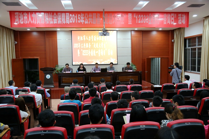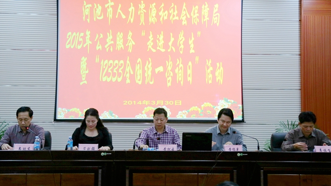 学院党委宣传部、就业办讯 3月30日晚,河池市人力资源和社会保障局在我院办公楼第二学术报告厅开展2015公共服务“走进大学生”暨“12333全国统一咨询日”活动。市人社局黄柯云局长、范利群副局长、我院黄绍光院长、韦胜东副院长、市就业局韦振飞局长出席了此次活动。参加活动的还有我院各系主要领导及分管就业领导,全体辅导员、班主任和各系学生代表。韦胜东副院长主持活动会议。
