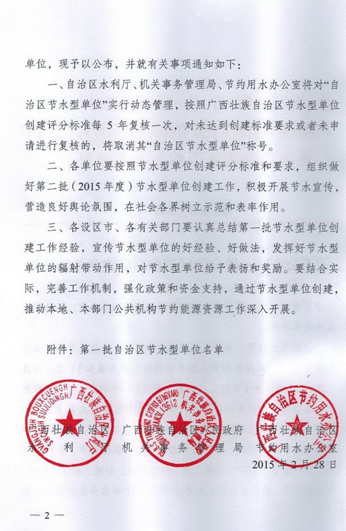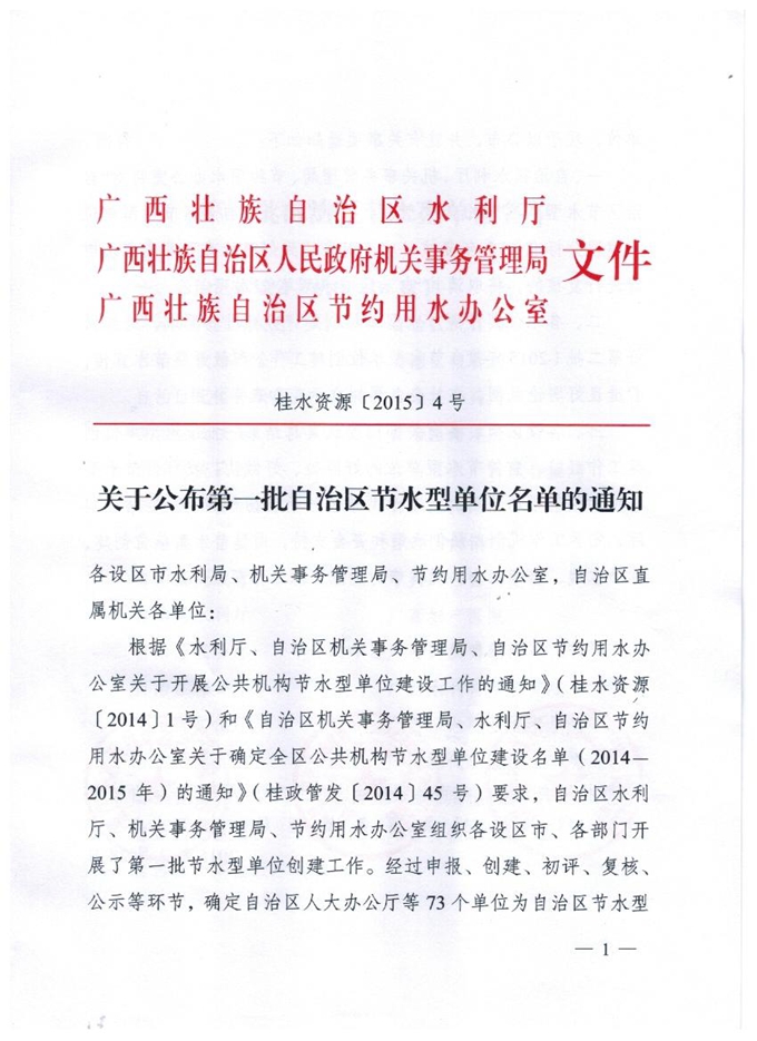 后勤管理处讯 近日,根据自治区水利厅、自治区机关事务管理局、自治区节约用水办公室《关于开展公共机构节水型单位建设工作的通知》和《关于确定全区公共机构节水型单位建设名单(2014-2015年)的通知》,我院被列为第一批全区公共机构节水型建设单位。