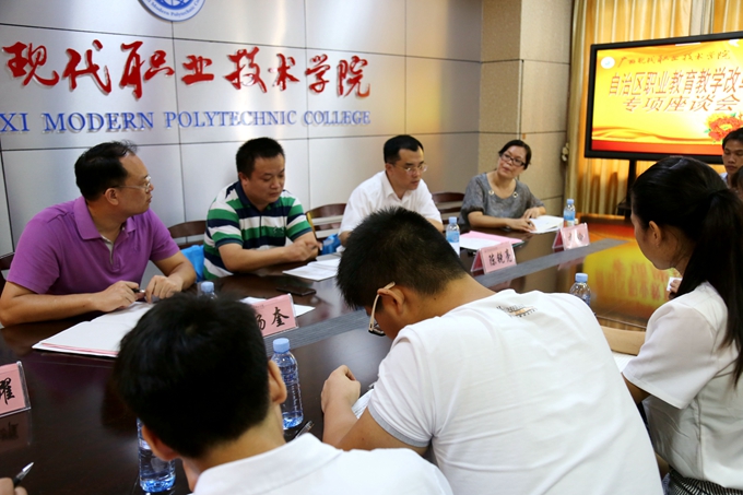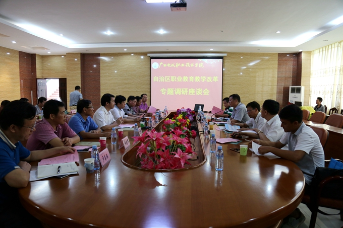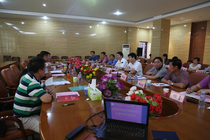 学院党委宣传部讯 7月1日下午,自治区教育厅职业教育教学改革调研组一行5人在桂林电子科技大学胡泽民副校长带领下,在市教育局副局长韦联克等领导陪同下,来到我院就推动职业教育修订和全国职教会议精神落实等情况开展调研并召开座谈会。市委副秘书长、学院党委书记韦伟松,党委副书记、院长黄绍光,副院长冯忠伟,院长助理韦建军、杨奎、卢森焕,学院办公室、党委宣传部、学工部、各系负责人、教师代表在图书馆会议室参加了座谈。会议由胡泽民主持。
