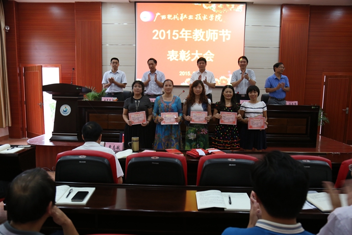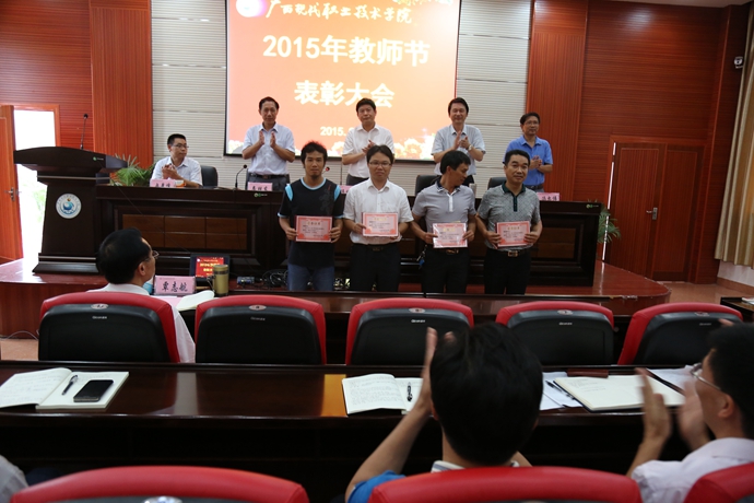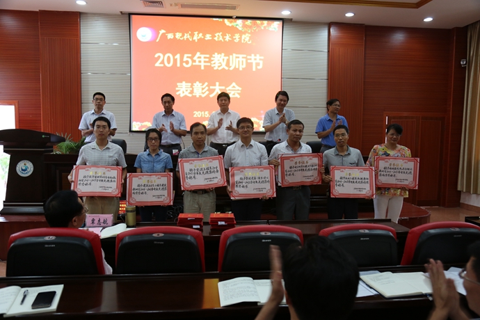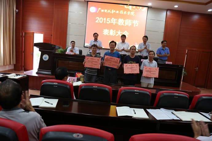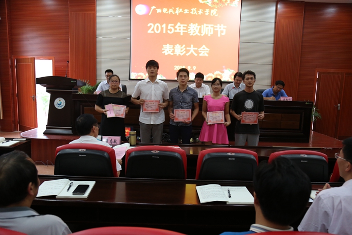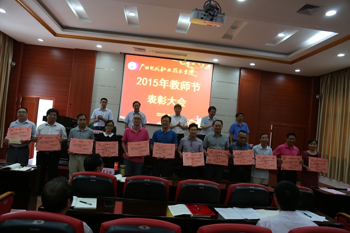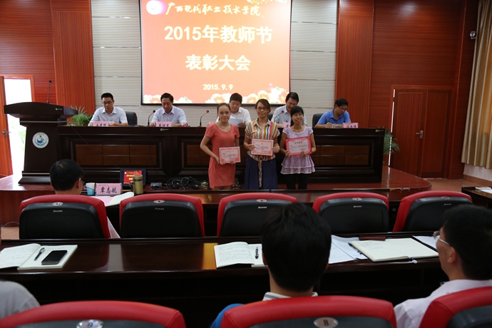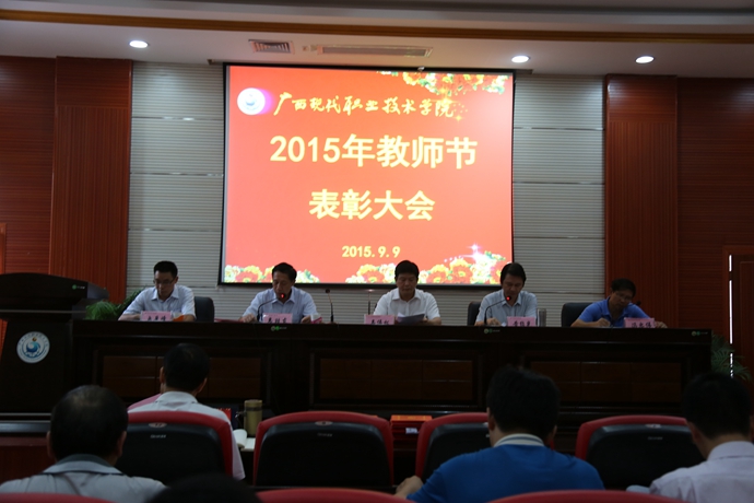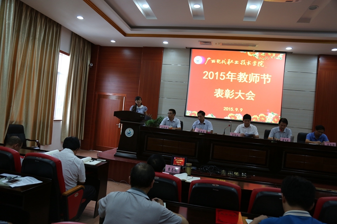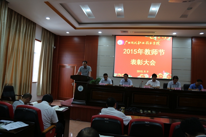 学院党委宣传部讯 9月9日下午,为庆祝第31个教师节,我院在第二学术报告厅召开了2015年教师节表彰大会,对过去一年先进教学系(部)处(室)、优秀教师、先进教育工作者、优秀辅导员、学生技能竞赛优秀指导教师、培训工作先进个人、招生工作标兵、教学标兵等先进集体和个人进行表彰授奖。学院党委书记韦伟松出席大会并作重要讲话。副院长韦胜东宣读学院关于先进集体和个人的表彰文件。大会由学院院长黄绍光主持。纪委书记冉景峰、副院长冯忠伟以及全体教职员工参加了表彰会。
