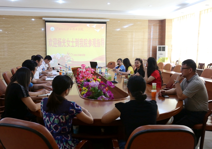 杨光女士一行在学院党委副书记、院长黄绍光的陪同下,首先参观了校园,然后到图书馆考察“春贵书库”。杨女士详细询问了“春贵书库”的馆藏情况,向随行的女儿们介绍姥爷捐赠的图书。杨女士看到父亲捐赠的图书被分类排架得整整齐齐,深受读者喜爱,非常高兴。考察结束后,学院有关领导、中层干部以及图书馆全体工作人员同杨光女士一行举行了座谈,院长黄绍光和馆长黄秀德分别向客人介绍学院的发展情况和馆藏建设情况,对杨校长一家关心支持学院建设表示衷心的感谢。杨光女士表示今后也会像父亲一样继续关心支持优米体育入口官网下载手机版的发展,还将发动更多的爱心人士关心支持学院建设,把对河池的爱,对优米体育入口官网下载手机版的关心支持代代传承下去。