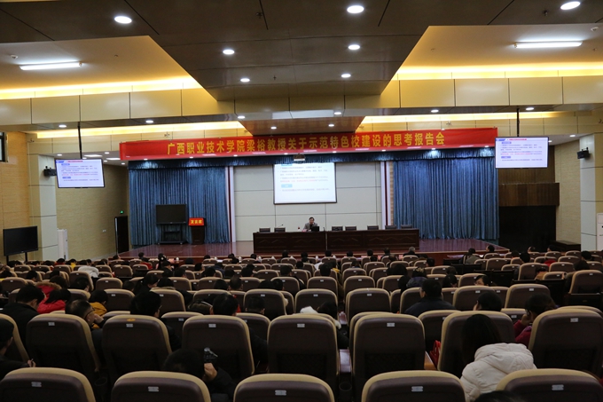 报告会上,梁裕教授从“现状与机遇”“内涵与要求”“实践与体会”“创新与发展”“创建工作建议”等5个方面做了展开阐述,并分享了很多广西职业技术学院申请示范校的艰辛历程。他强调,申请示范校是一项艰巨的任务,做好顶层设计至关重要。学院的自我定位、改革、发展与管理需要全院师生的共同努力,后示范”建设更是重点与难点。最后,梁裕教授提出,组织学习培训,更新教育理念,掌握示范校建设内涵,确定实施项目等实质建议,并鼓励更多的教职员工亲自参与到示范校建设的项目中去。