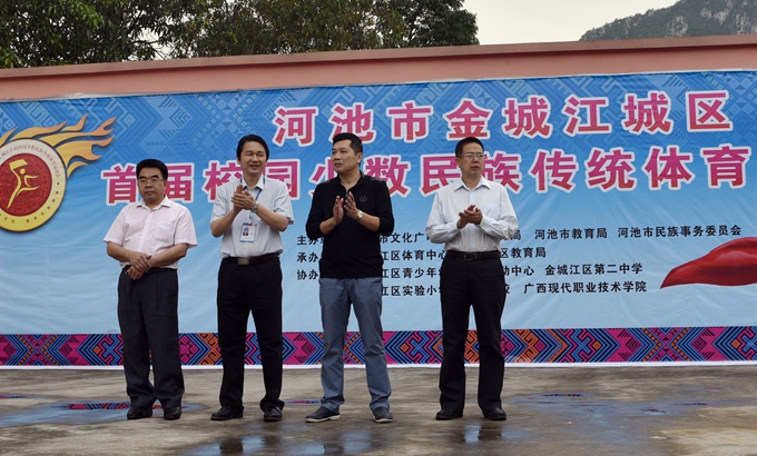 学院党委宣传部讯 4月29日,由市文化广电新闻出版体育局、市教育局、市民族事务委员会联合主办的河池市金城江城区首届校园少数民族传统体育运动会在我院田径场举行。市文化广电新闻出版体育局局长杨卫群、市教育局副局长文德生、市民族事务委员会副主任唐毓坤及我院院长黄绍光出席开幕式。