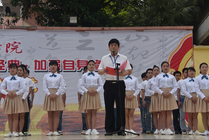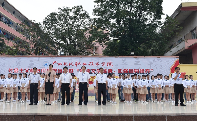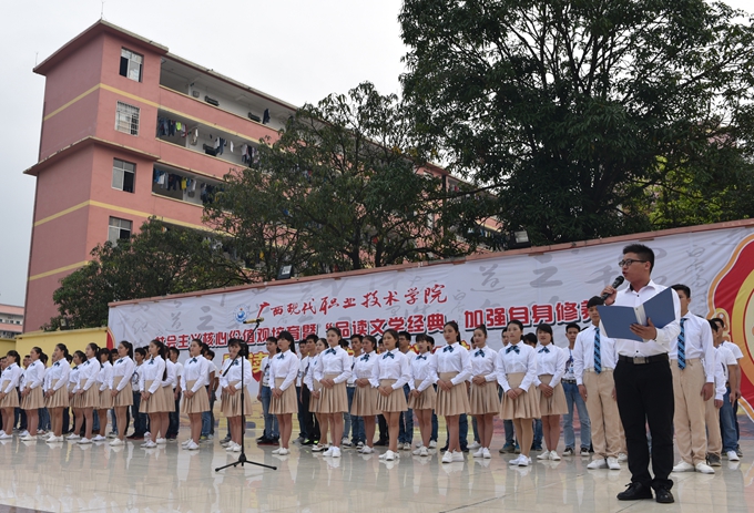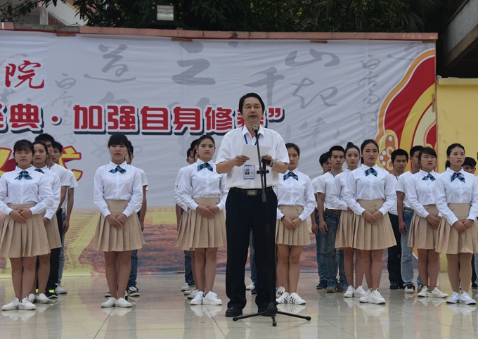 本站讯(宣传部 莫青青) 5月9日上午7时,我院在学院文体广场举行社会主义核心价值观培育暨“品读文学经典﹒培育爱国情怀”晨读活动启动仪式。学院党委书记韦伟松、学院院长黄绍光、市职业教育中心学校党委书记黄丹峻,副院长韦胜东、纪委书记冉景峰、副院长冯忠伟出席了启动仪式。全体教职工及在校学生参加仪式。仪式由副院长冯忠伟主持。