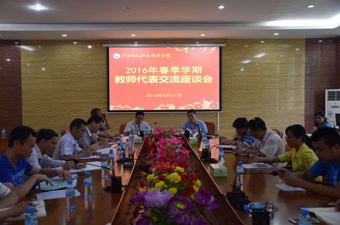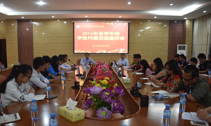 本站讯(宣传部 莫青青) 为了解学院广大师生对学院各方面工作的意见和建议,提高师生的满意度,我院分别于5月25日、26日、27日在图书馆会议室召开高职(普通班)、“3+2、2+3”以及教师代表座谈会。学院党委副书记、副院长霍江华,副院长韦胜东、纪委书记冉景峰出席了会议。相关职能部门负责人、各系主要领导及师生代表参加会议。