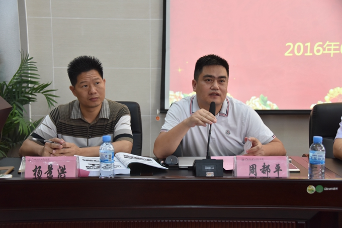 本站讯(宣传部 黄思涵) 6月22日上午, 广西河池电子商务创业学院师资培训班开班典礼在我院第一学术报告厅举行。学院院长黄绍光,河池市职业教育中心学校副校长唐启焕,河池市商务局副局长蒲员胜,福瑞致远公司总经理杨简红,国泰安公司电商事业部总经理周郝平出席了本次开班典礼。我院和职业教育中心学校130名教师参加典礼。仪式由学院学院院长助理、经济管理系主任杨奎主持。
