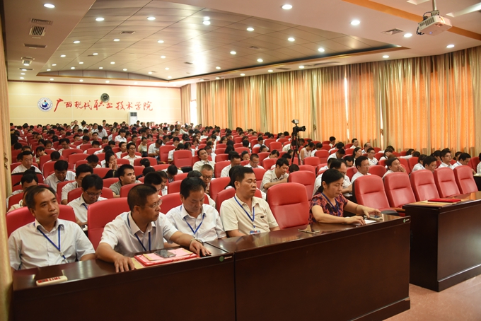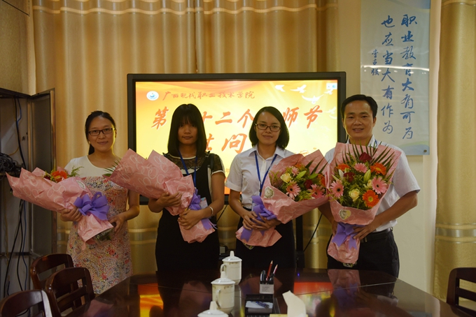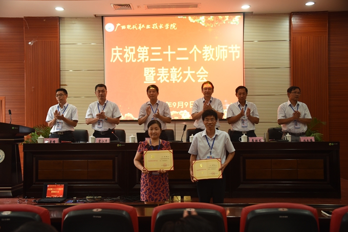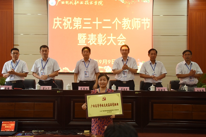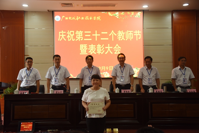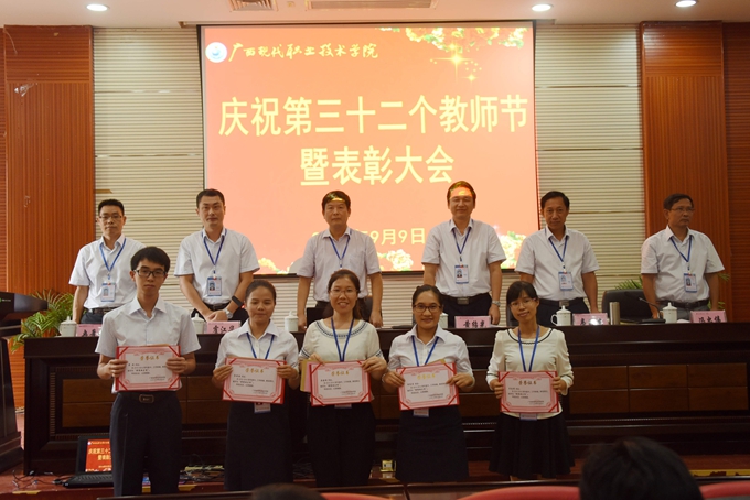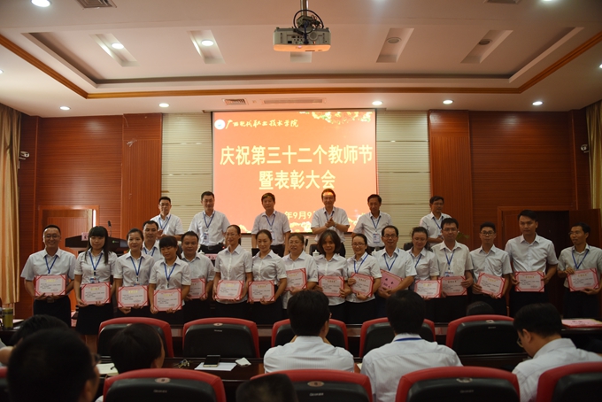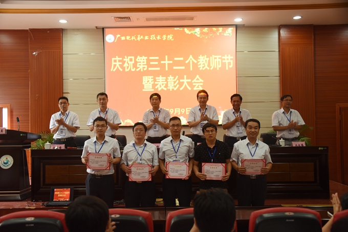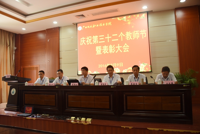 本站讯(宣传部 莫青青) 为庆祝第32个教师节,9月9日下午,我院在第二学术报告厅召开了2016年教师节表彰大会,对过去一年先进集体、优秀教师、先进教育工作者、优秀班主任或辅导员、学生技能竞赛优秀指导教师、教师技能竞赛奖、就业工作先进个人、培训工作先进个人、项目建设突出贡献奖和教学标兵等进行表彰授奖。学院党委书记韦伟松,院长黄绍光,党委副书记、副院长霍江华,副院长韦胜东,纪委书记冉景峰,副院长冯忠伟出席表彰大会。全体教职工参加表彰大会。表彰大会由学院党委副书记、副院长霍江华主持。