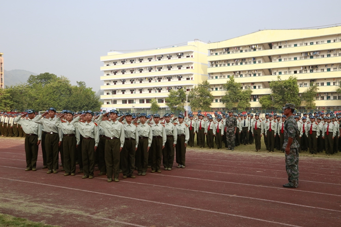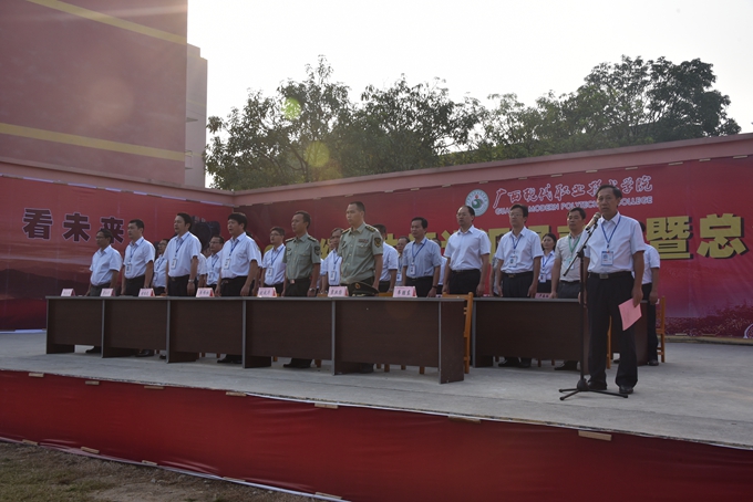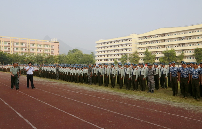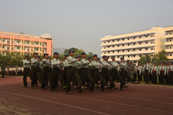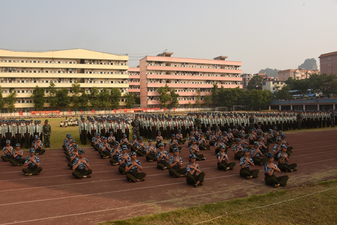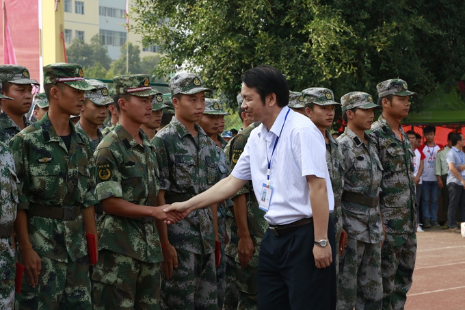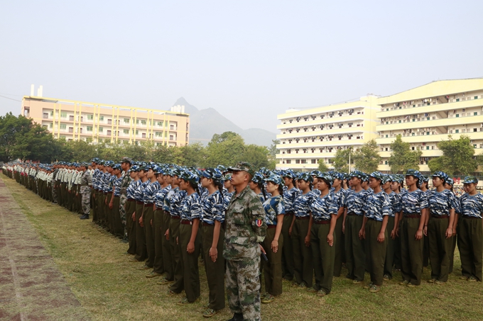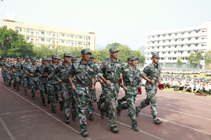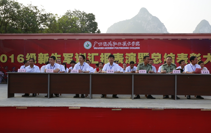 本站讯(宣传部 莫青青) 飒爽英姿秋点兵,激昂斗志威震天。9月21日上午,我院2016级新生军训汇报表演暨总结表彰大会在学院体育场隆重举行。学院党委书记韦伟松、院长黄绍光,市职教中心学校领导、南宁警备区领导、金城江区消防大队领导、绿邦国防教育训练基地领导及学院党委副书记、副院长霍江华,副院长韦胜东,副院长冯忠伟出席了军训汇演。学院各系部、处室主要领导、各系分管学生工作领导及2016级全体师生参加军训汇演。汇演活动由副院长韦胜东主持。