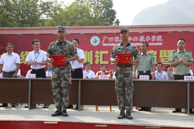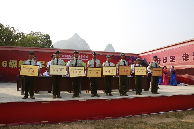 汇演结束后,学院学工处副处长黄仕珍宣读了2016级新生军训表彰情况并组织颁奖,承训方绿邦国防教育基地领导作讲话。