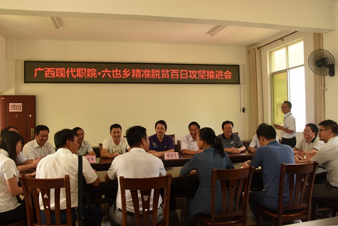 学院领导还与六也乡领导,加司村、华善村两委开展了“广西现代职院·六也乡精准脱贫百日攻坚推进会”。会上,加司村、华善村村支书分别汇报了两村的基本情况,并提出了扶贫工作中遇到的问题。我院派驻两村的第一书记分别汇报了贫困户基本情况及脱贫规划。大家就遇到的问题展开讨论,畅谈发展,为村民脱贫致富找出路。