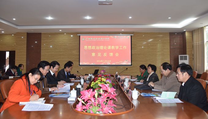 11月25日上午,以广西中医药大学陈雪斌教授为组长的自治区教育厅2016年秋季学期高校思想政治理论课教学巡视工作组一行四人到我院检查工作。巡视工作共分为听取汇报、随堂听课、实地检查、师生座谈会、意见反馈等五个环节。学院院长黄绍光、副院长韦胜东出席汇报会、反馈会并陪同检查。院长助理卢森焕、社科部主任韦朝忠及社科部全体思想政治理论课教师参加会议。