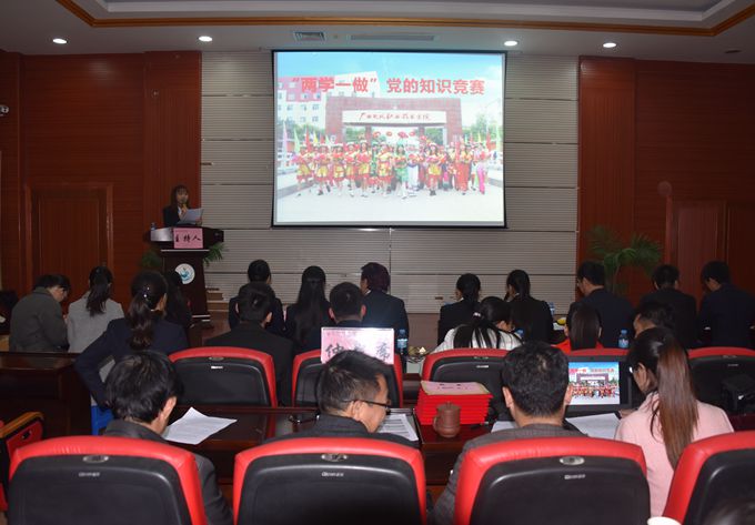 为推动我院“两学一做”学习教育扎实深入开展,加深各基层党总支党员对党的历史、党的知识、党的理论和路线方针的认识,激发全院党员教职工爱党、爱国热情,11月28日晚,我院在第二学术报告厅举行“两学一做”党的知识竞赛。学院党委副书记、副院长霍江华、副院长韦胜东、纪委书记冉景峰出席并担任评委。全体党员教职工到场观看比赛。