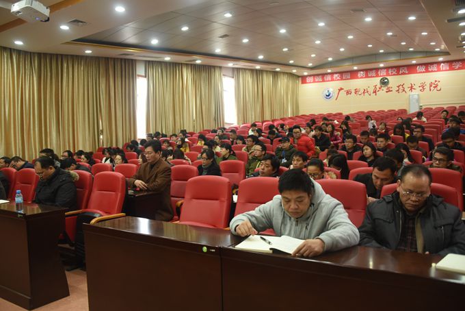 又讯 1月12日,广西壮学研究会、美学协会副会长,广西民族大学研究生导师银建军到我院作专题讲座。我院以及市职业教育中心学校全体班主任到场聆听讲座。