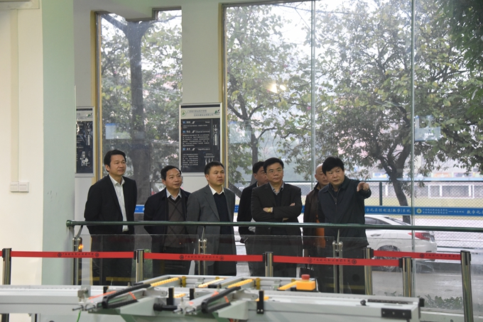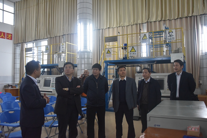 黄雄彪一行先后参观了电商学院、学前实训室、马上办服务中心、工业机器人实训室、冶金实验室、驾校等地。调研中,韦伟松书记向黄雄彪一行详细汇报了学院的办学情况、特色专业等。在工业机器人实训室,黄雄彪副厅长率饶有兴致地详细询问了机器人运行情况和操作流程,对我院在工业机器人专业建设方面取得的成绩给予了充分肯定。