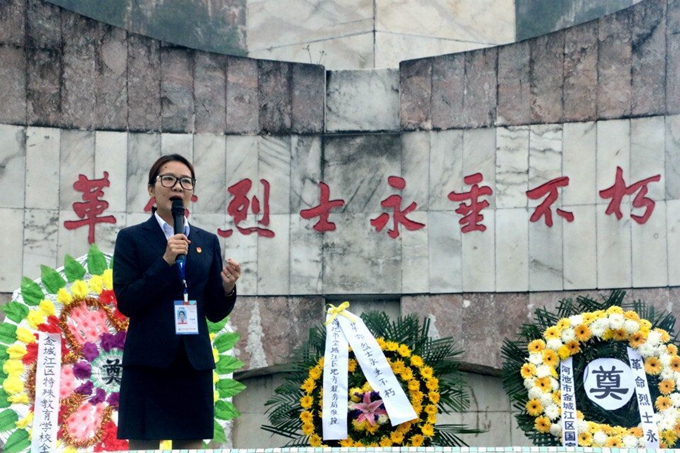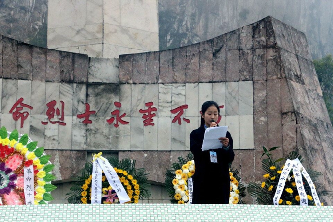 学院团委书记李媛媛作烈士纪念碑下的讲话,她带领大家回顾了韦拔群等老一辈革命家的光辉事迹。她希望,广大青年大学生要铭记历史,肩负复兴中华的重任,坚定社会主义理想信念,争做有理想、有追求、有担当、有作为、有品质、有修养的‘六有’大学生。