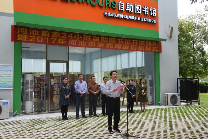 中共河池市委宣传部副部长李卫珍宣布24小时图书馆开馆。