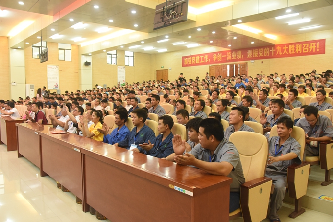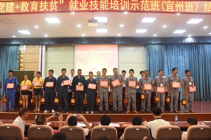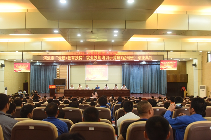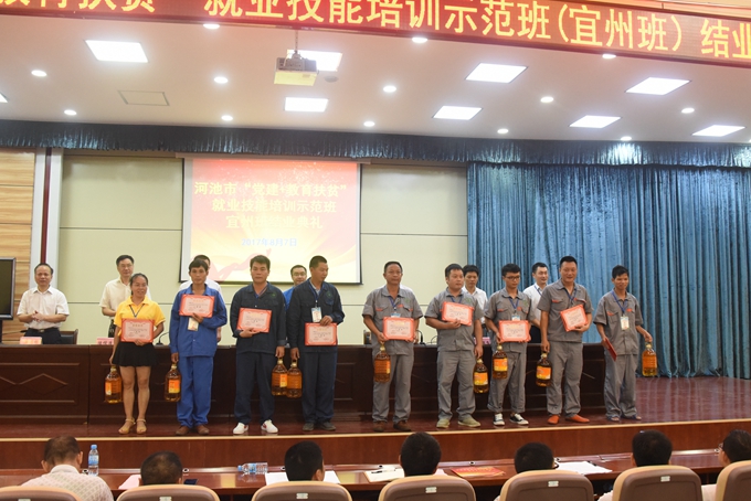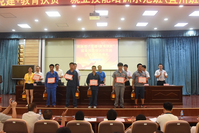 8月7日上午,河池市“党建+教育扶贫”就业技能培训示范班(宜州班)结业典礼在市职业教育中心学校厚德厅召开。学院党委书记、市职业教育中心学校校长韦伟松,宜州区委副书记龙校、市扶贫办副调研员陆儒清、市就业局局长韦振飞、学院党委副书记、副院长霍江华,市职业教育中心学校副校长唐启焕出席会议。本期培训班全体学员、培训班指导教师、班主任参加会议。会议由宜州区委常委、组织部长高鑫主持。
