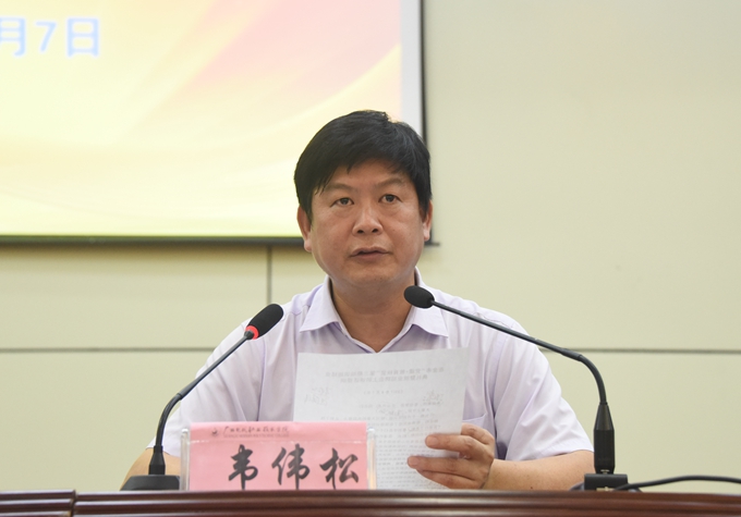 学院党委书记、市职业教育中心学校校长韦伟松在会上讲话。韦伟松指出,此次培训呈现三个特点:一是高度重视、周密安排;二是目标明确、特色突出;三是成效明显,很受欢迎。两院校班子高度重视“党建+教育扶贫”工程,这个假期两院校领导和相关部门同志均没有休息,为培训班做了大量工作。党政主要领导亲自抓示范班的培训工作,安排最好的班主任,选派最好的老师,提供最好的服务、设备,确保学员安心学习,放心学习,真正学到知识和技术。韦伟松强调,“一人培训,一人就业,一家脱贫”是落实习近平总书记提出拔掉“穷根”,实现脱贫致富最有效的办法。全体学员要懂得感恩,回馈社会;要立志就业、奋发图强;要感恩学习,练成行家。学院和市职业教育中心学校将不断总结、不断提升,实现更高的标准,更高的水平,把培训工作做得更好。