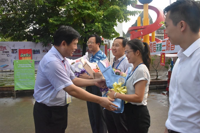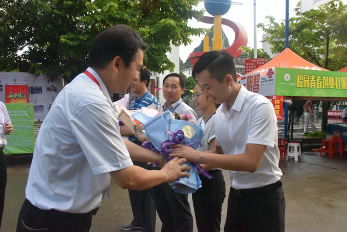 学院党委书记韦伟松为“教师节”仍坚守迎新工作岗位的教师献花