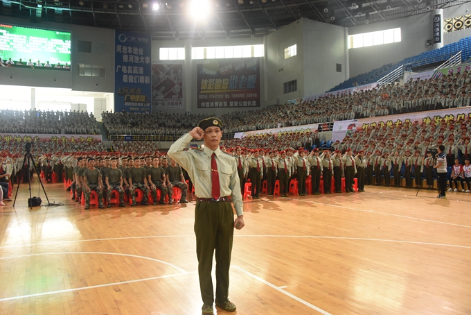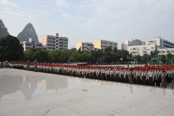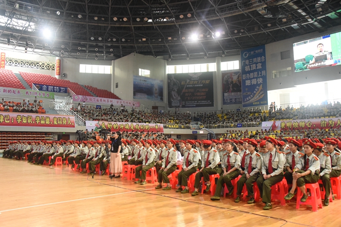 9月14日上午,我院在市体育馆举行2017级学生军训动员大会。院长黄绍光,学院党委副书记、副院长霍江华,副院长韦胜东、纪委书记冉景峰、副院长冯忠伟等领导出席大会。会议邀请了南宁警备区中校郑文武、广西军区综合训练队少校黄业勋、金城江区消防大队教导员覃业扬、金城江区街道办武装部部长罗振刚、军训主训官陈徵出席大会。学院各相关职能部门负责人、2017级班主任、全体带训教官和2017级新生参加大会。大会由学工处处长李铃主持。