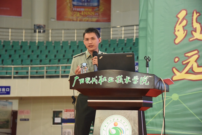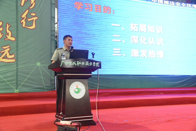 当天上午,广西军区综合训练队少校黄业勋为2017级学生作了题为《中国周边安全环境》的国防军事理论专题讲座。