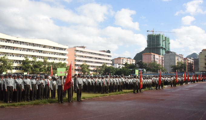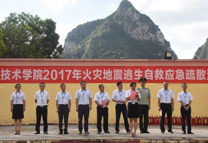 9月25日上午,我院与河池市金城江区消防大队、中队联合开展2017年火灾、地震逃生自救应急疏散演练活动。学院党委副书记、副院长霍江华,河池市金城江区消防大队、中队领导等出席活动。学院保卫处负责人、各系党总支副书记、承训教官和2017级全体新生参加活动。活动由学院学工处处长李铃主持。