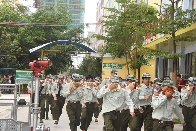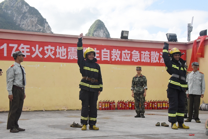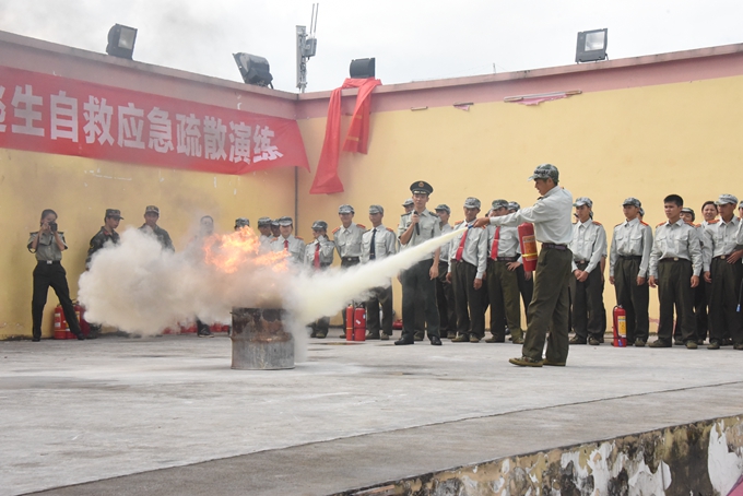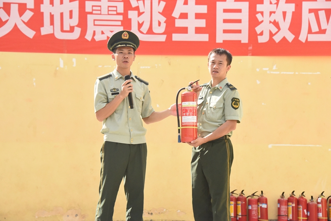 在活动中,金城江消防大队、中队官兵为2017级学生讲解了火场逃生知识、灭火器的使用、快速穿戴消防服、消防安全常识,消防官兵做示范、引导学生进行现场操作;还为学生进行了火灾地震逃生自救相关知识的培训。消防官兵随后组织学生进行模拟火场疏散逃生演练,随着消防车警报声响起,学生在消防官兵的指导保护下,按规定工作有序从宿舍跑到安全地带集合。