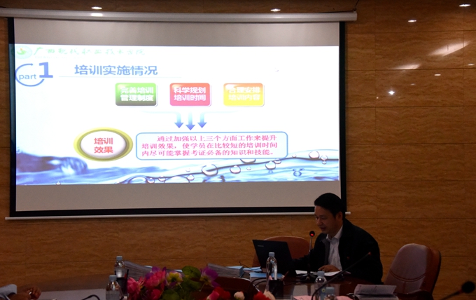 汇报会上,学院院长黄绍光就培训工作的实施情况、工作成效、遇到的困难与问题、意见和建议等方面向专家组作项目验收汇报。