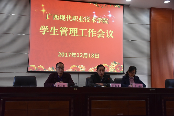 会上,学工处处长李铃作期末班主任技能竞赛、培训工作等安排;学工处副处长、宿管中心主任黄仕珍作学生宿舍工作情况汇报。