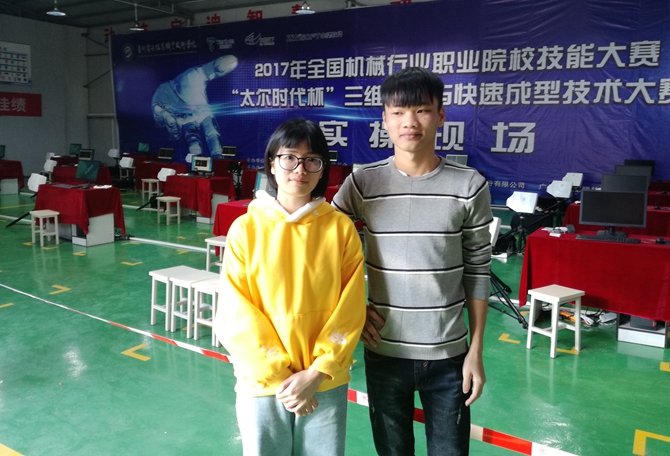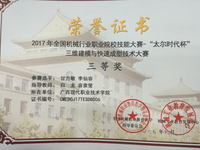 为加强职业院校学生三维建模与快速成型技术应用能力,促进教学改革与先进制造技术发展相适应,进一步提升职业院校相关专业人才培养质量,为3D打印行业发展输送更多技术好专业强素质高的技能人才,2017年12月22-24日,2017年全国机械行业职业院校技能大赛“太尔时代杯”三维建模与快速成型技术大赛在贵州凯里贵州电子信息职业技术学院举行。我院机电系白龙、容隶莹老师带领16模具班甘方敏、李仙容同学组成的代表队荣获高职高专组三等奖。