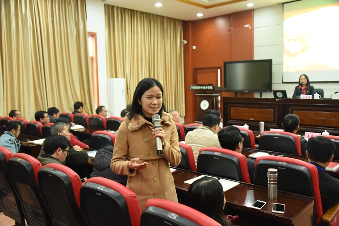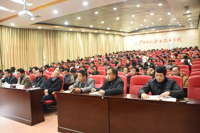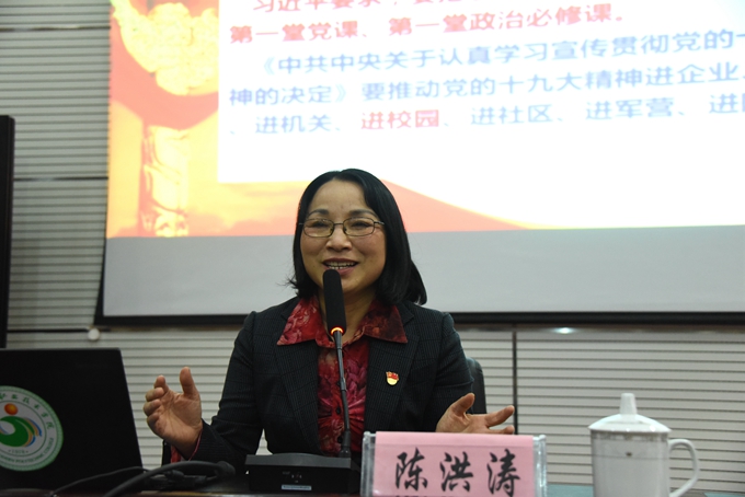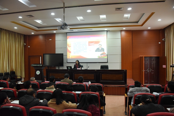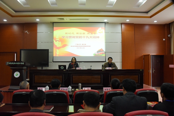 12月27日下午,自治区党委讲师团特聘教授专家,广西大学行健文理学院副院长陈洪涛教授到我院宣讲党的十九大精神,近300名师生在学院第二学术报告厅聆听报告。院长黄绍光、副院长韦胜东、纪委书记冉景峰、工会主席覃志航出席。院长黄绍光主持报告会。