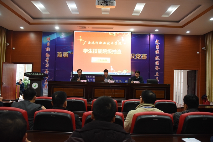 12月29日上午,我院组织开展2017-2018年度学生专业技能抽查活动。学院党委书记韦伟松、院长黄绍光、副院长韦胜东出席现场抽查活动,全体中层干部参加抽查活动。学院党委书记韦伟松进行网络抽查。