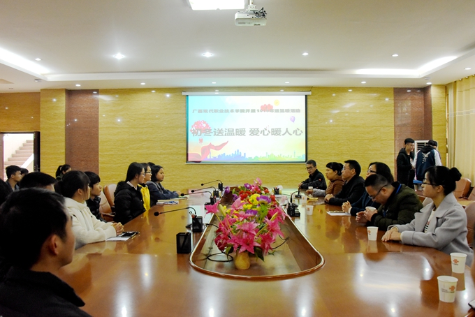 为切实解决同学们冬天保暖问题,保障学生的学习生活,1月12日早上,我院在图书馆会议室开展了“初冬送温暖 爱心暖人心”活动。学院纪委书记冉景峰、学生工作处处长李铃出席活动。活动由学工处副处长刘丽红主持。