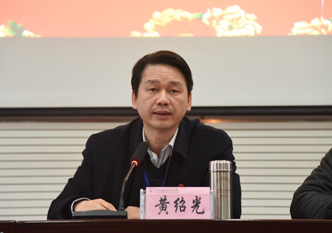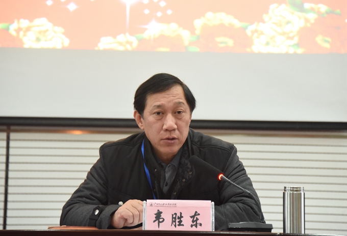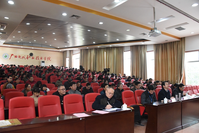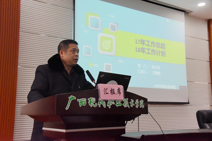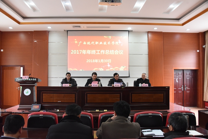 在当天下午召开的2017年秋季学期期末总结会上,院长黄绍光对2017年工作进行总结,部署安排2018年主要工作。黄绍光指出,2017年,学院领导班子一心一意谋发展,全体教职工开拓创新促成效,学院各项工作稳定协调发展,全年工作呈现十大亮点:全体教职工思想高度统一、状态大幅提升;质量持续提高,竞赛有新突破;新生报到创新纪录,规模历史最大;出口畅通,就业再获殊荣;引企入校,校企深度融合;加大投入,基础设施更完善;致力扶贫,社会培训有新招数;全员育人,全面启动德育品牌;校园活跃,民族活动得传承;做好服务,师生满意度提升。黄绍光强调,2018年是贯彻党的十九大精神的开局之年,是改革开放40周年,是广西壮族自治区成立60周年,也是学院成立40周年,全体教职工要持续发力,把思想变成信仰,把意志变成力量,把理论变成行动,把责任变成忠诚,把知识变成能力,要坚持立德树人底线,明确发展任务;深化教育教学改革,强化发展内涵;抓紧抓好学生管理,确保发展质量;加强校园基础建设,巩固发展基础;提升科研创新能力,展示发展水平。要切实抓好内部质量诊改工作,强力推进三全育人工作,加强校园文化建设,构造学校文化品牌,着力提高政治素养和业务能力,增强共事意识,促进学院各项工作实现新发展。