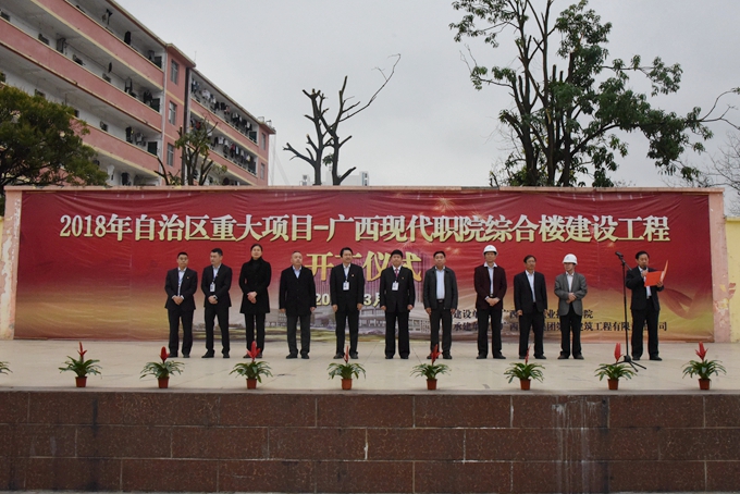 3月6日上午,我院综合楼建设工程开工仪式在学院舞台隆重举行。学院党委书记韦伟松、院长黄绍光、市职业教育中心学校党委书记黄丹峻、市教育局副局长韦联克,中国农业银行河池分行党委书记、行长秦一超,广西建工集团第五建筑工程有限责任公司总经理助理、南宁分公司党委书记、分公司经理杜福昌,学院党委副书记、副院长霍江华等领导出席仪式。学院全体中层领导干部、广西建工集团第五建筑工程有限责任公司有关人员参加仪式。仪式由副院长韦胜东主持。
