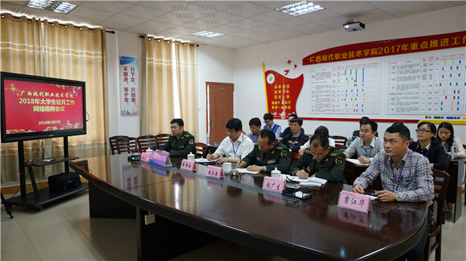 4月3日上午,教育部、中央军委国防动员部联合在北京召开全国大学生征兵工作网络视频会议,重温习近平主席给南开大学新入伍大学生重要回信精神,研究分析形势任务,对2018年度大学生征兵工作进行了全面部署。教育部副部长孙尧,军委国防动员部副部长牟明滨少将出席会议并作重要讲话。我院设立分会场,河池军分区副司令员赵永安、学院党委书记韦伟松、河池军分区国防动员处处长张广生、河池市金城江区人民武装部部长彭良辉、副院长霍江华出席会议,学院相关职能部门负责人参加会议。
