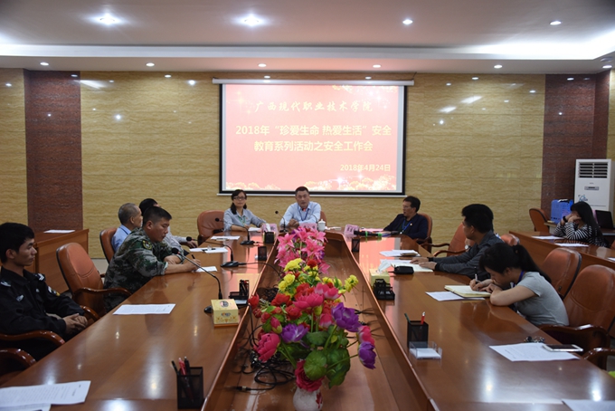 为加强校园安全稳定,营造安全、文明的校园环境,4月24日下午,我院在图书馆会议室召开“珍爱生命,热爱生活”安全教育系列活动之安全工作会议。学院党委副书记、副院长霍江华,学工处处长李铃,保卫处处长覃建雅、学工处及保卫处全体人员、广西莱华保安服务有限公司负责人及全体保安人员参加了会议。会议由保卫处处长覃建雅主持。