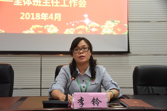 会上,李铃处长首先作总结发言。她肯定了近期班主任工作所取得的成效,并指出,要继续坚持立德树人,强化思想引领,主动适应学生的新常态,以学生的成长成材为重点,加强思想教育工作。学院开展的晨读、“书香现代,气质青春”读书活动、“珍爱生命,热爱生活”安全教育活动、国旗下的讲话等一系列活动形成新常态,在引领师生思想教育和社会主义核心价值观引领上有很大作用;在节假日前后统计学生离返校率工作、宿舍安全隐患大排查、精准的资助评审发放等方面也取得不错的效果。同时,李铃强调,学工处应加强对班主任和班级工作的指导,加强班主任队伍建设,不断提高班主任队伍的整体素质,提高学生管理信息化整体水平,打造属于我院特色的强大管理工作的学生平台。