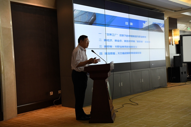 上图:中国职业技术教育学会副会长俞仲文发表“新经济、新业态、新技术呼唤新职 教”主题演讲