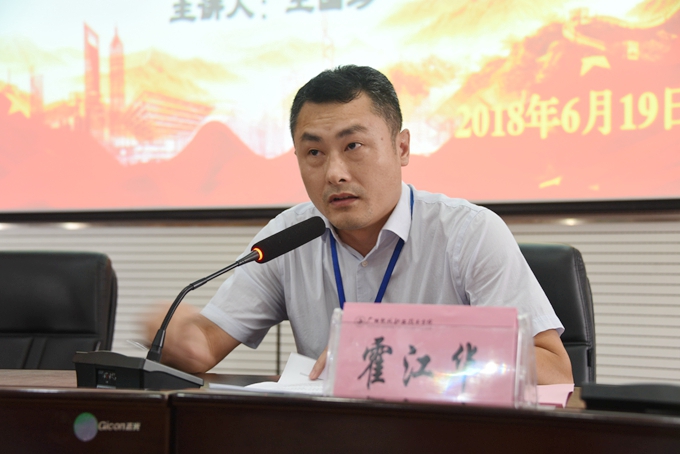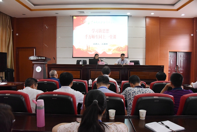 6月19日,我院开展“学习新思想 千万师生同上一堂课”活动,深入学习贯彻习近平总书记5月2日在北京大学师生座谈会和5月4日在纪念马克思诞辰200周年大会上的重要讲话精神。柳州铁道职业技术学院王国珍教授应邀到校宣讲。学校院长黄绍光,副院长韦胜东,以及全体教职工到场聆听。活动由学院党委副书记、副院长霍江华主持。