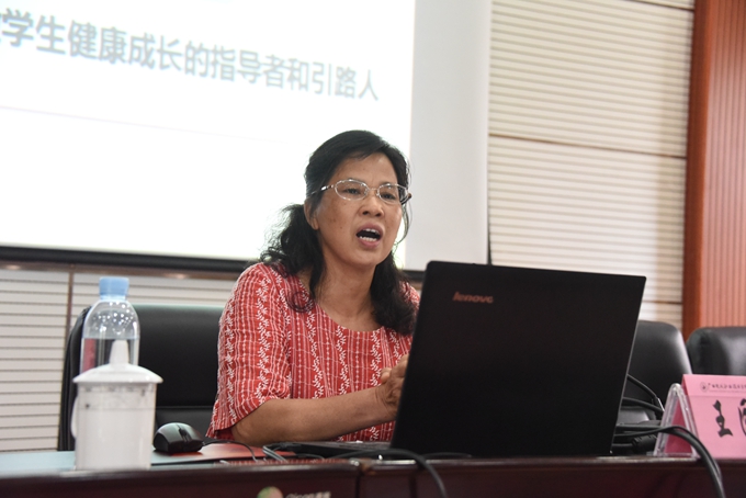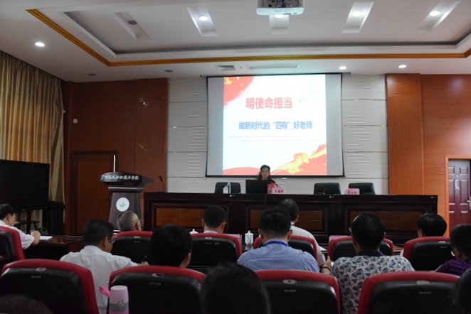 王国珍教授以“明使命担当 做新时代的‘四有’好老师”为主题,从“新时代教育工作的共同使命”、“新时代‘四有’好老师标准”和“做学生健康成长的指导者和引路人”三个方面,深刻阐述了社会主义大学的根本任务、教育的根本目的和使命,指出要把立德树人的成效作为检验学校一切工作的根本标准,内化到大学建设和管理各领域、各方面、各环节,做到以树人为核心,以立德为根本。